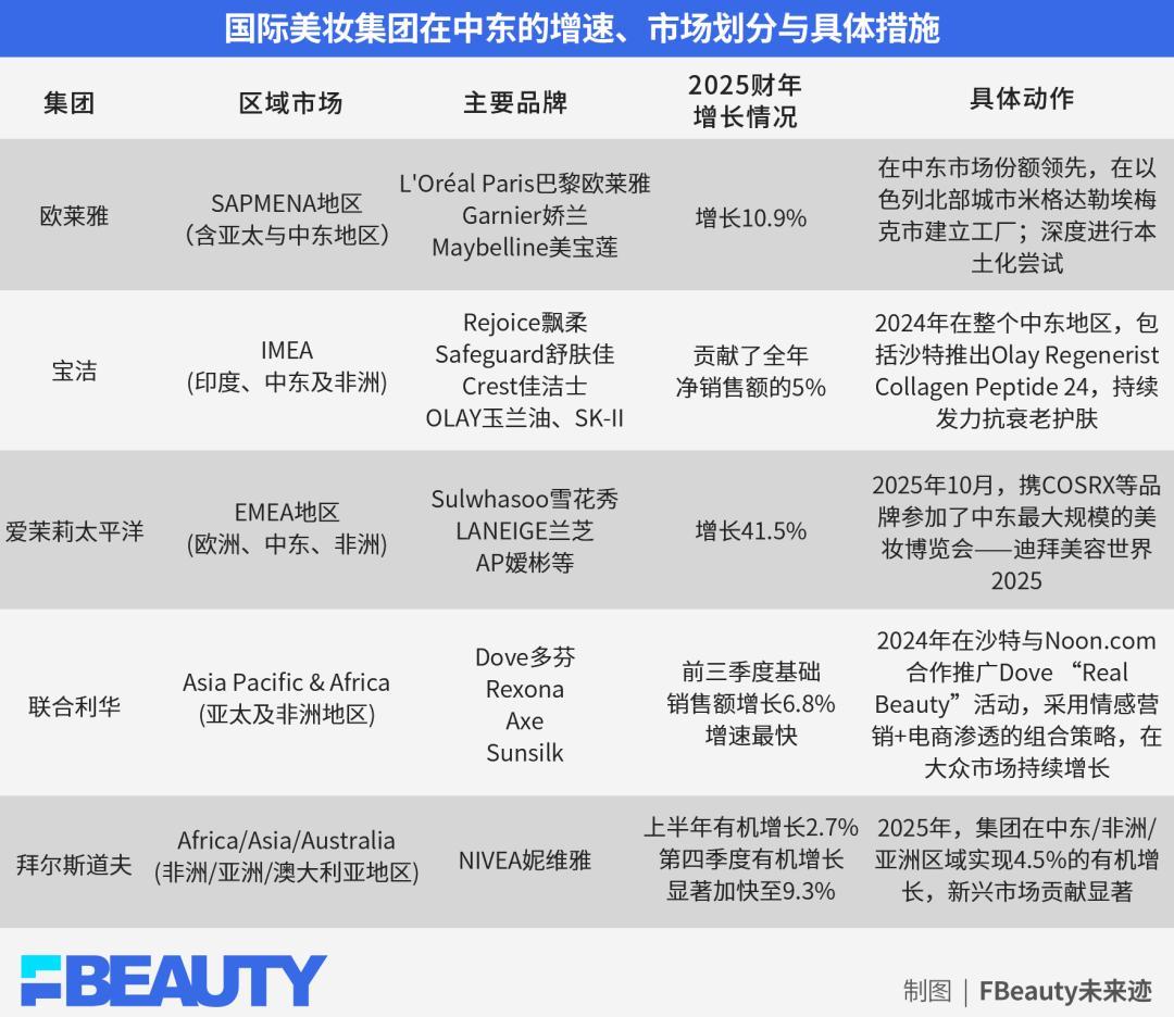 过去,由于地理构成复杂、政治局势多变,中东通常只是大区划分中的一部分:欧莱雅把它并入SAPMENA,宝洁将其纳入IMEA,很多集团在财报中很少单独拆解。但近两年一个明显变化是,它们开始在组织、供应链与渠道端实打实地加码。